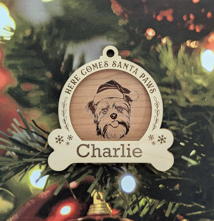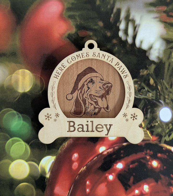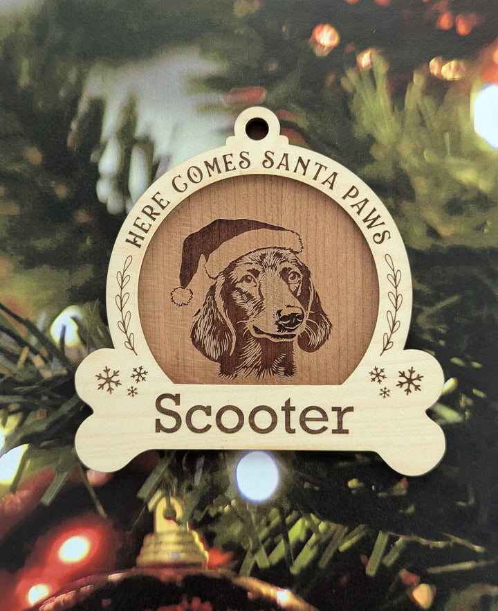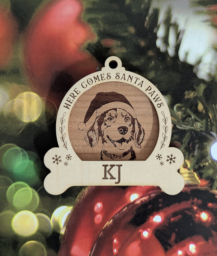 Custom Dog Christmas Ornaments made form 2 layers of wood. Choose from 31 dog breeds. And be sure to give me your pup's name for me to engrave on the bottom!
